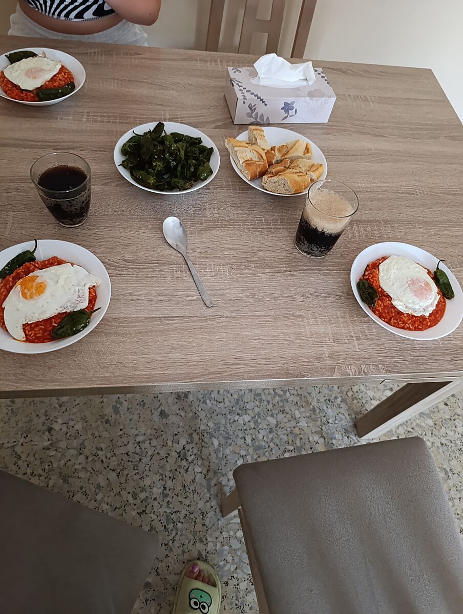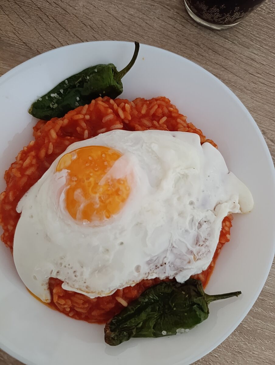 Будет рис с томатом и луком, с жареным яйцом и жареные маленькие перчики. Готовить будет мой мужчина ( испанское блюдо)