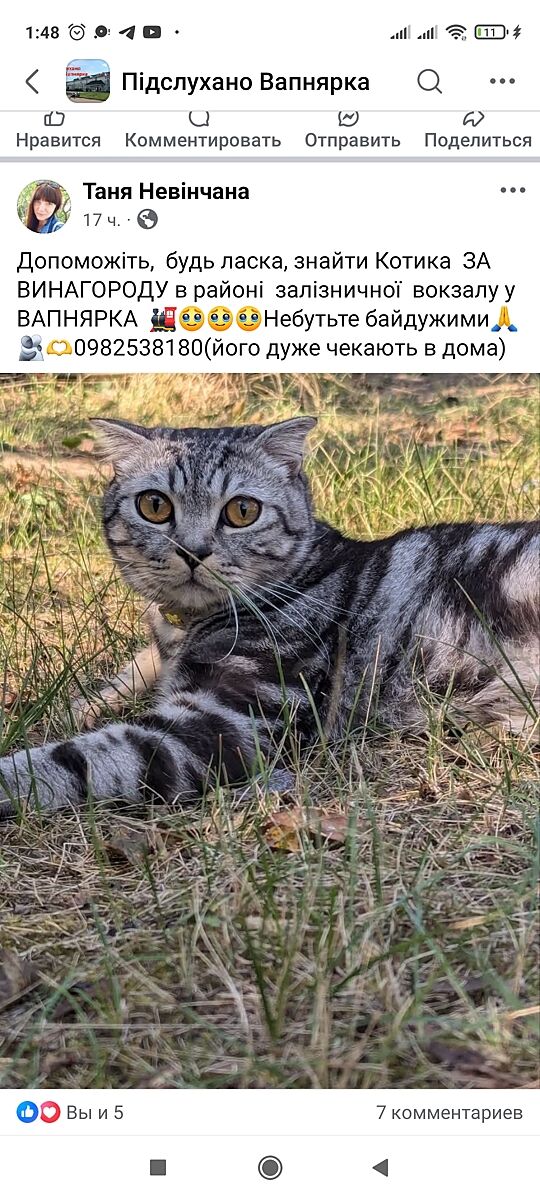 Здравствуйте. Потерялся кот( девушка ехала проездом , убежал на станции) объявление выставили в группу поселка , но никто не отозвался. Возможно здесь есть кто-нибудь местный ?