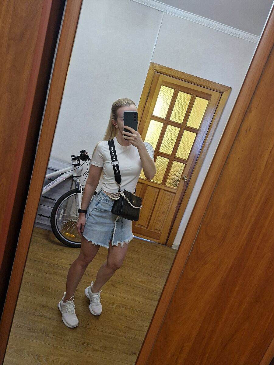 Есть такая юбка классная, выше колена на 10см, нежно голубая, хлопковая, так красиво в ней даже в кроссовках. И с рубашкой заправленой..