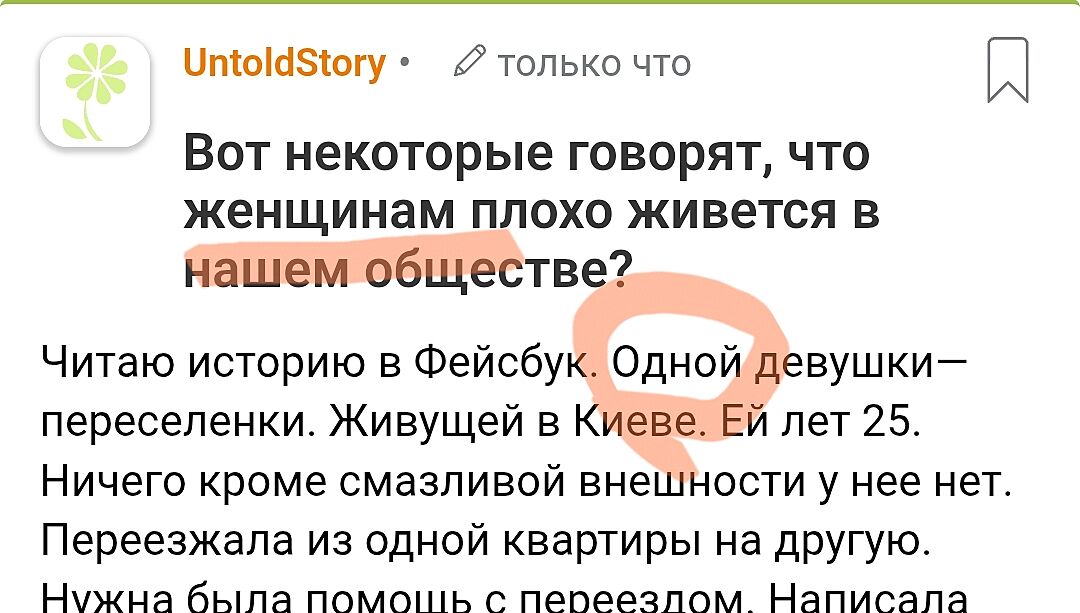 Читаю историю в Фейсбук. Одной девушки—переселенки. Живущей в Киеве. Ей лет 25. Ничего кроме смазливой внешности у нее нет. Переезжала из одной квартиры на другую. Нужна была помощь с переездом. Написала пост в Фейсбуке. Через час получила десятки предложений от парней и мужчин, которые готовы были помочь. Нашла какого-—то дурачка, которые сделал всю необходимую ей работу. Перенес, занес, где надо починил, она просто наблюдала и «курила бамбук» в это время. Он потратил несколько часов своего выходного дня, чтобы решить ее проблемы, в итоге не взял с нее ни копейки, а взамен предложил сходить с ней в кино— она согласилась, и этот олень еще в кино за нее заплатил. Нормально так?