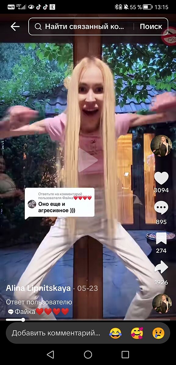Иногда попадаются видео с ней, она очень агрессивно реагирует когда ей пишут,,вам нужно к врачу и тому подобное,,