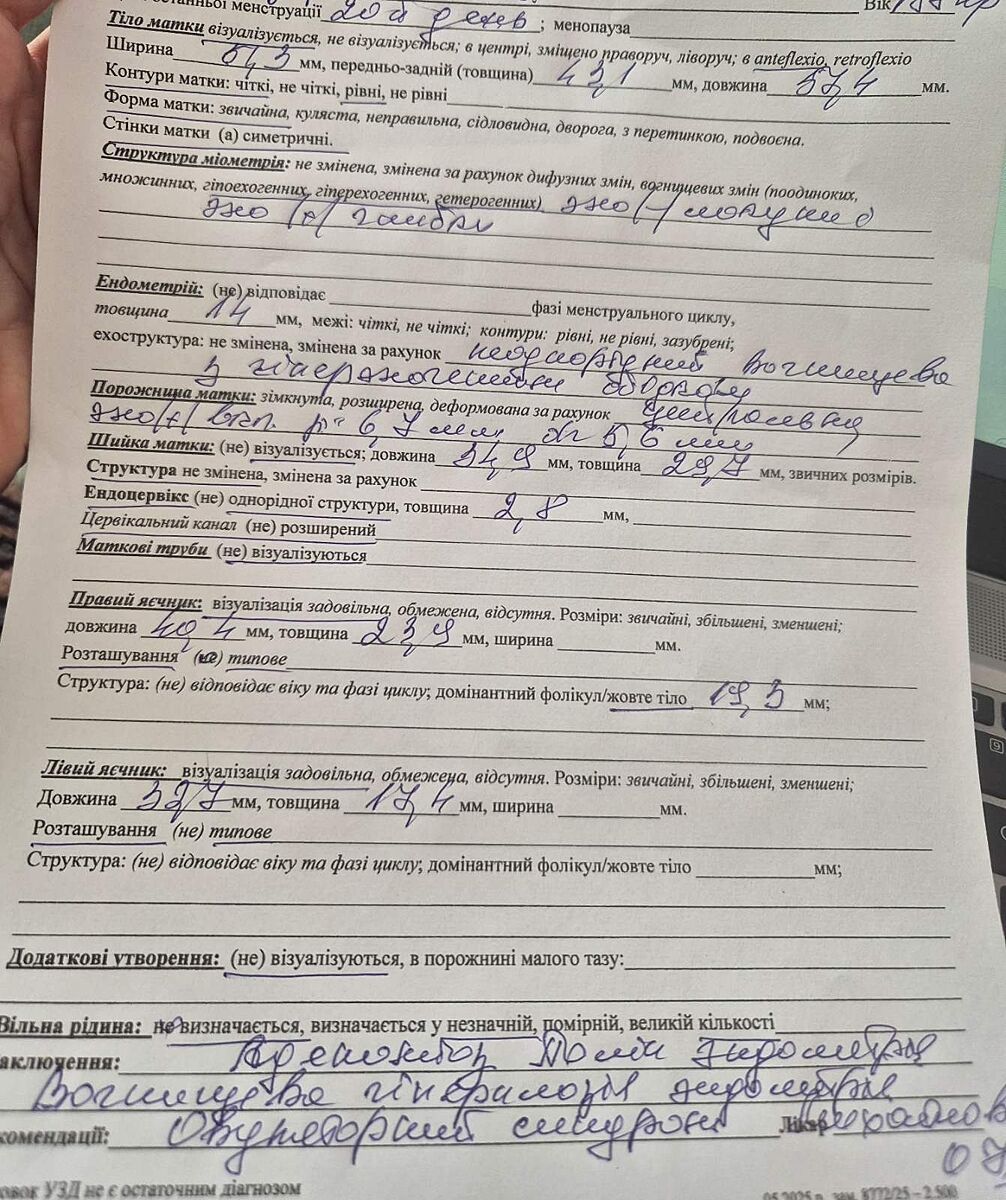 Сьогодні зробила УЗД: аденоматоз. Поліпи ендометрію. Вогнещева гіперплазія ендометрія. Ендометрій 14 мм. 20-й день циклу. Мені 40 років.