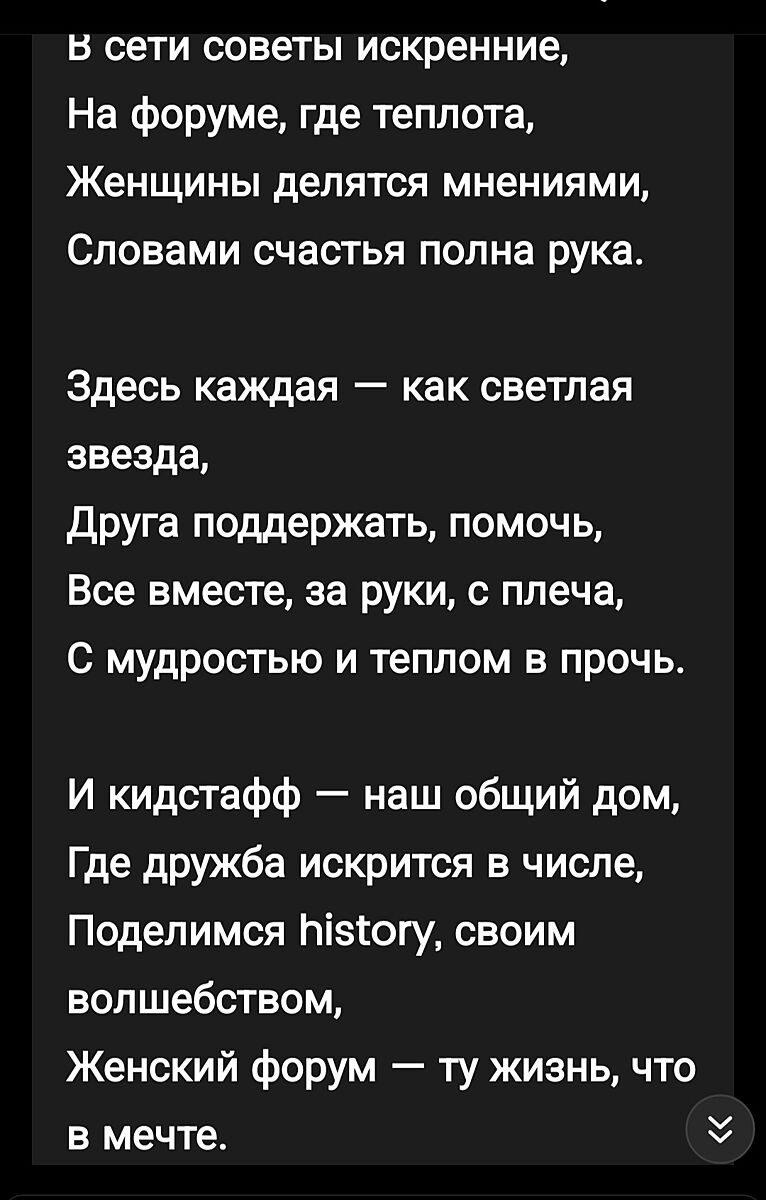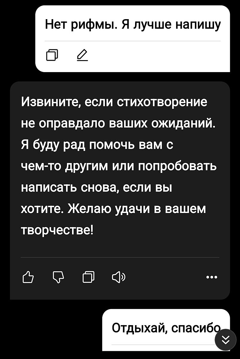 Кстати попросила чат написать стих про нас, советчиц. Мне не понравилось вообще. Плохо, напыщено и набор слов. Я злая