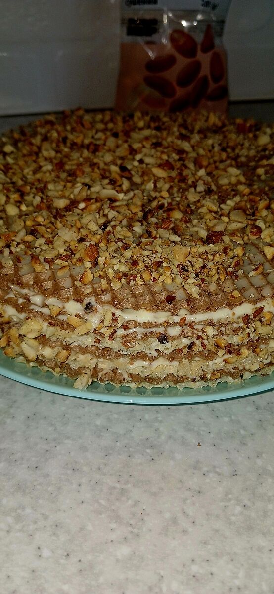 Вафельні коржі, крем: взбити пачку м´якого масла, додати банку згущенки сирої і ще раз добре взбити міксером. В кінці додати горішки підсмажені( в мене арахіс був) і перемелені і ще трішки збити. Крем просто пушка, такий смачний. Ще читала так роблять замість горішків кокосова стружка