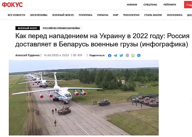 Так, украинский Фокус обращает внимание на то, что вооружения из России поставляются не только по железной дороге,но и авиа.«Летом российские транспортные самолеты Ил-76 и Ан-124-100 начали полеты на беларуские аэродромы, в частности на авиабазу в Мачулищах», — пишет издание.