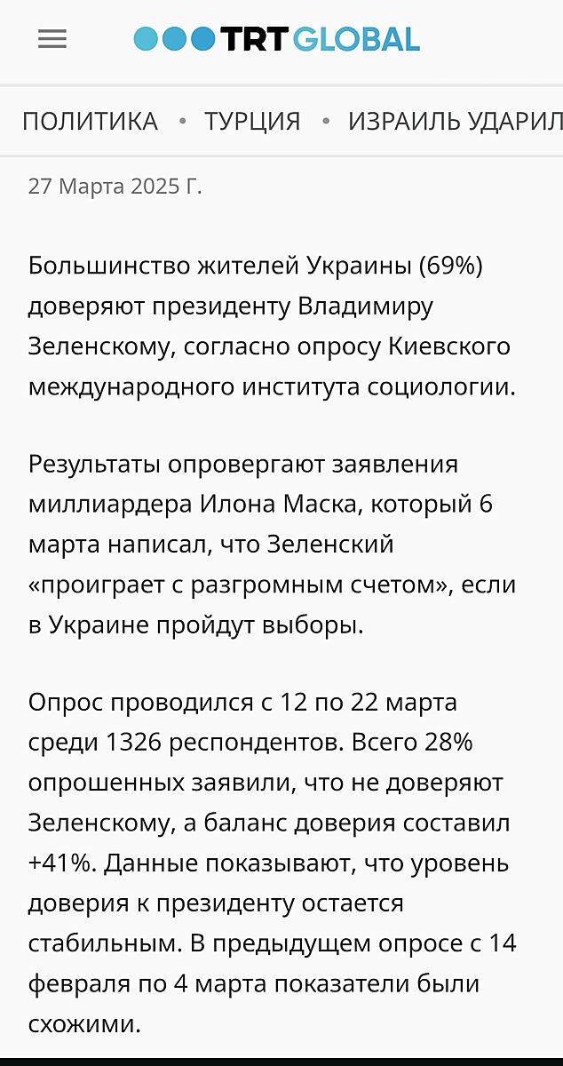 За його даними, 65% українців довіряють Зеленському, не довіряють — 30%. Відповідно, баланс довіри-недовіри становить +35%.