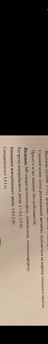 * **Спондильолістез L4 I ст.** — зміщення хребця L4 вперед (1 ступеня).