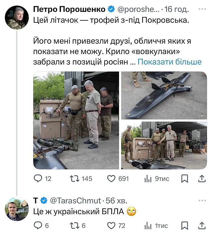 Снова попиарился,а на дроне украинским языком написано,что это наш дрон,а не кацапский.Но акакаяразница,народ и так схавает.Лишь бы фоточки благодетеля. Порошенко опубликовал в Х вечером 12 июня. «Этот самолетик — трофей из-под Покровска. Его мне привезли друзья, которых я показывать не могу. Крыло вурдалака забрали с позиций россиян под Котлиным. Как вы сами понимаете, они же и утилизировали владельцев этой нечисти», — написал политик в своей публикации.Однако в комментариях военные и волонтеры сразу указали на ошибку. В частности аналитик Тарас Чмут написал, что это украинский БПЛА, а не российский трофей. Это подтвердил также и общественный деятель и блогер Сергей Стерненко.