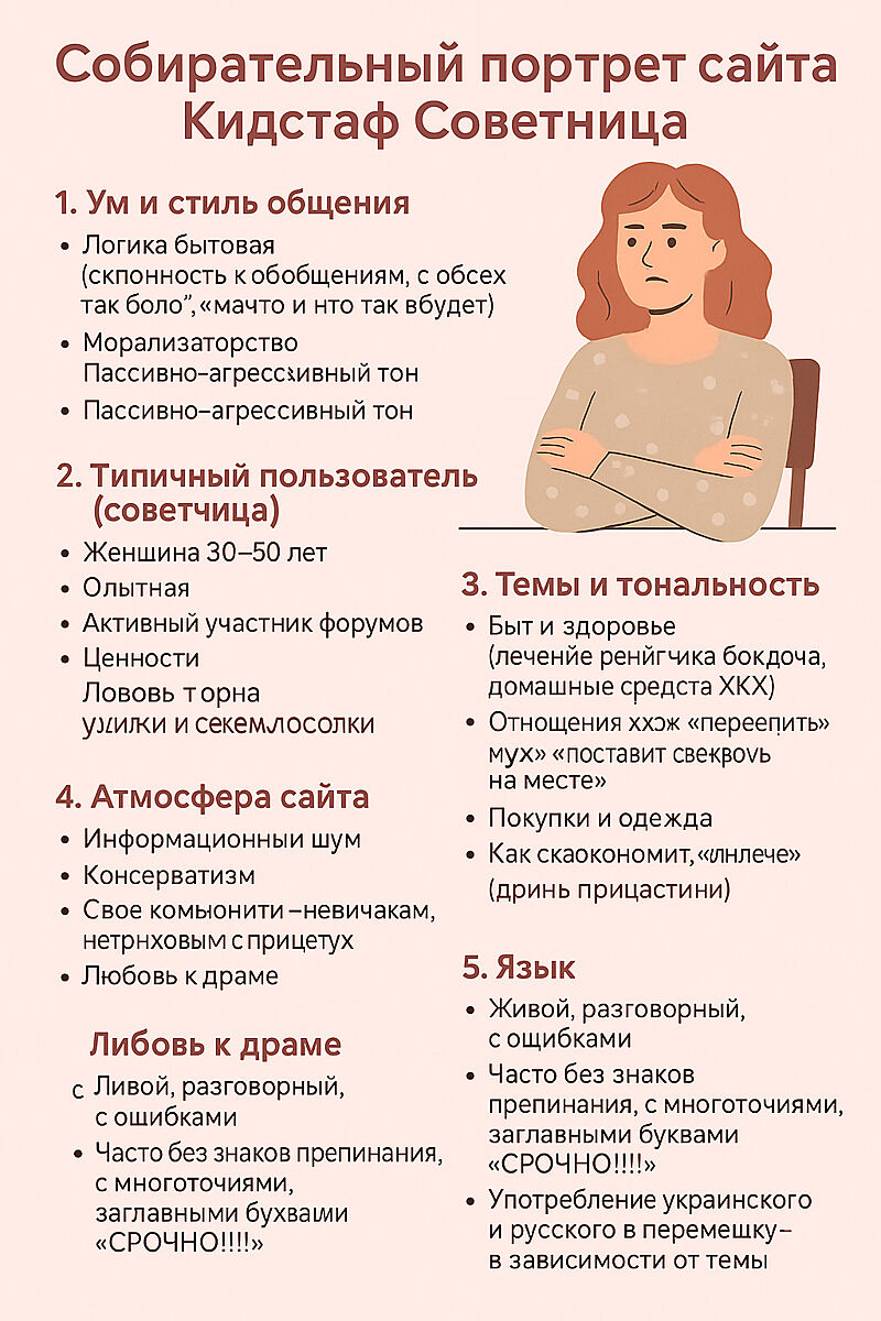 Собирательный портрет сайта Кидстаф Советница — это психологический и стилистический образ среднего участника, менталитета, поведения и атмосферы сайта. Вот как можно представить его:
