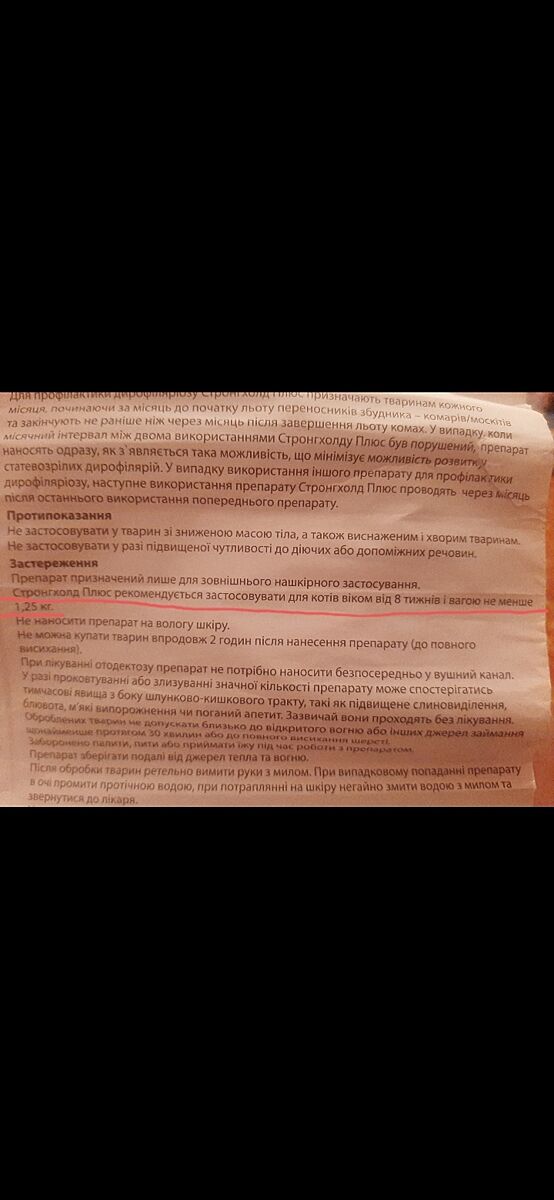 Нашла инструкцию ,я своей кошке его покупала ,там инструкция одна на все дозировки,написано от 8 недель и вес не менее 1.25 кг