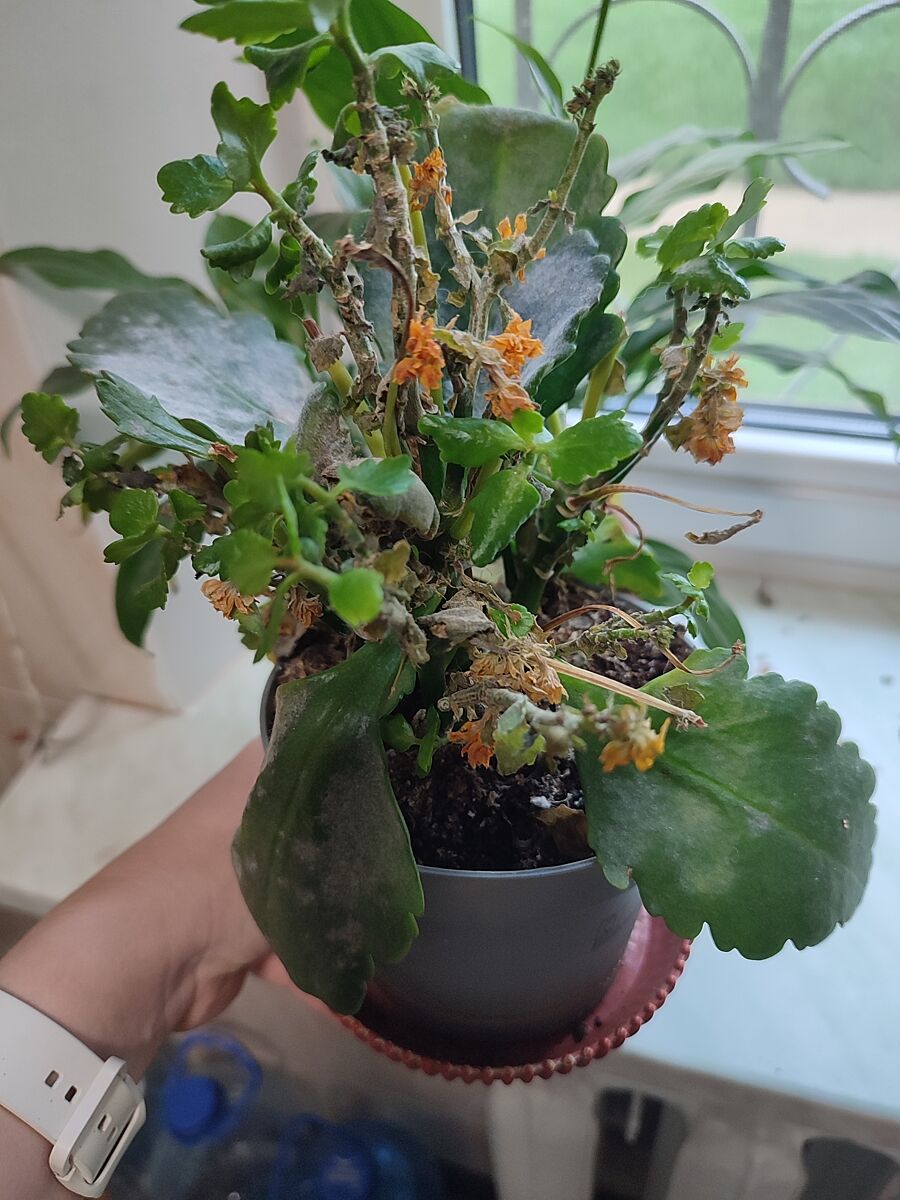 Прибрати все засохше. Судячи по листям то їх їсть кліщ. Поприскати фітовермом чи актеліком 3 рази через кожні 5-7 днів . Фітоверомом можна в жилих приміщеннях, актеліком в нежилих типу балкон, під’їзд. Поставили в мусорний пакет і поприскали добряче, завязали пакет і хай постоїть 12 годин. Цього достатньо , щоб подохли всі дорослі особини. Потім вилупляться нові кліщі, ви знову їх оприскаєте і третім раз контрольний. Каланхоє оживе ще після першого разу. Тільки не ’зваріть’ квітку залишивши в пакеті в дуже теплому місці чи на сонці.