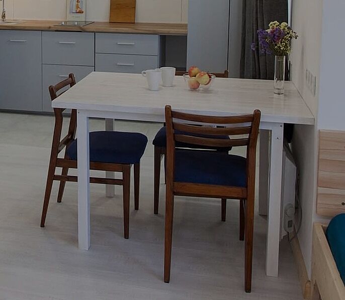 в вашем случае я бы перекрасила) белый стол, а стулья тараканьего цвета?.. и синий цвет сидушек вообще не в тему)
