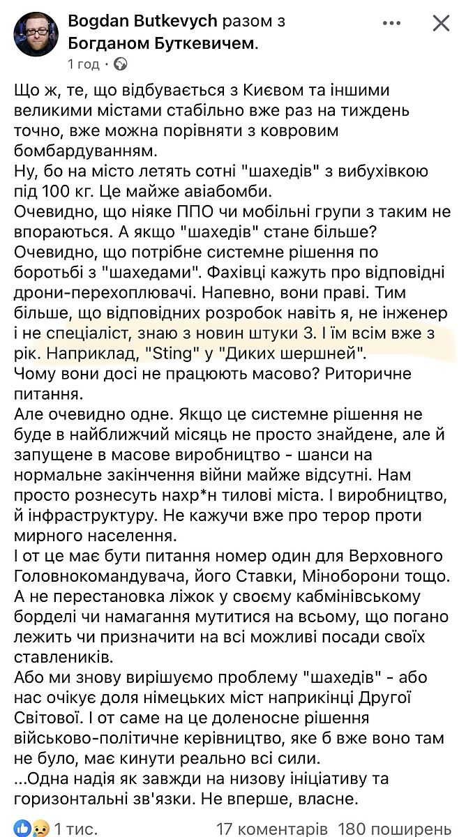 Щось змінилось в захисті міста, вам не здається? Ми ходимо в підвал, але це вже не врятує. Раніше ракети збивали, тепер щось змінилось і це змінює нашу відносну безпеку. Не хотілось, але тепер замислююсь про виїзд, бо двоє дітей.