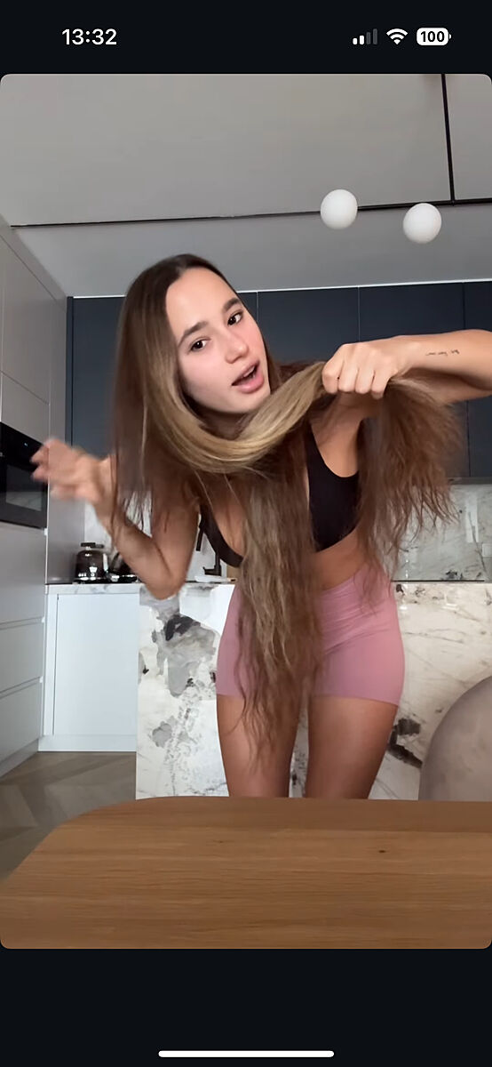 На скрінах. Її волосся хвилясте і нарощене теж хвилясте. Колір теж співпадає