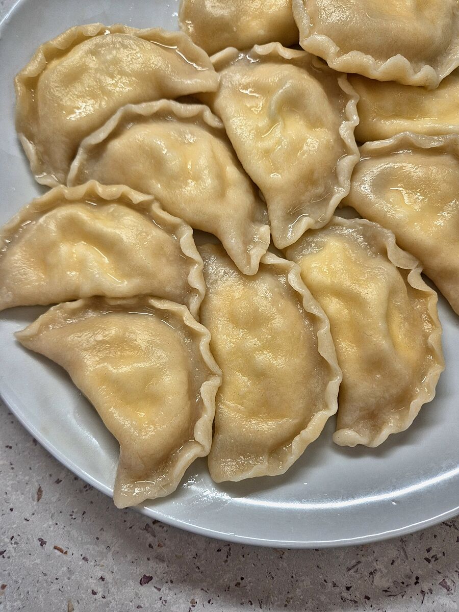 У нас вареники с соленым творогом и кисель кизиловый за кадром.