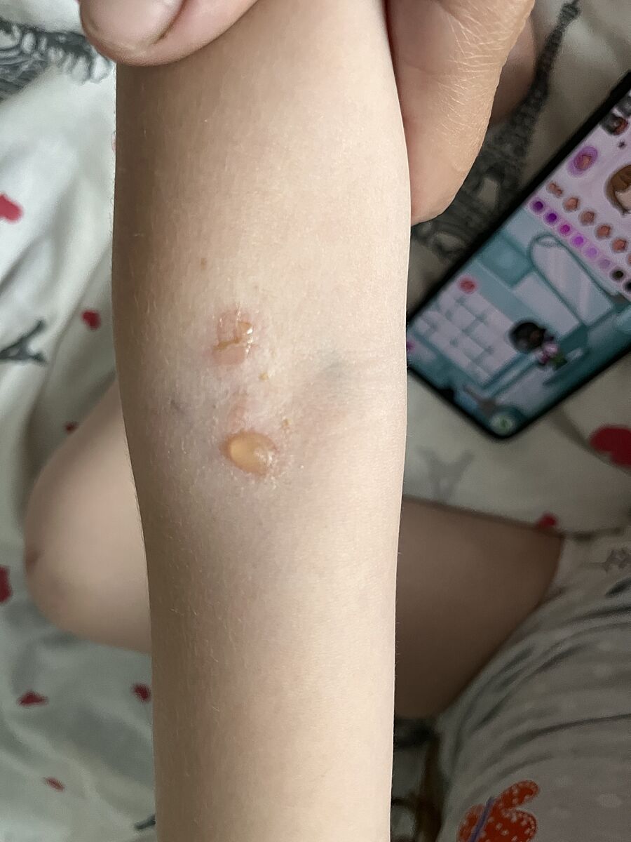 Зранку прокинулися в середині ліктя пухирці, вчора не було, ввечері упала збила коліно.