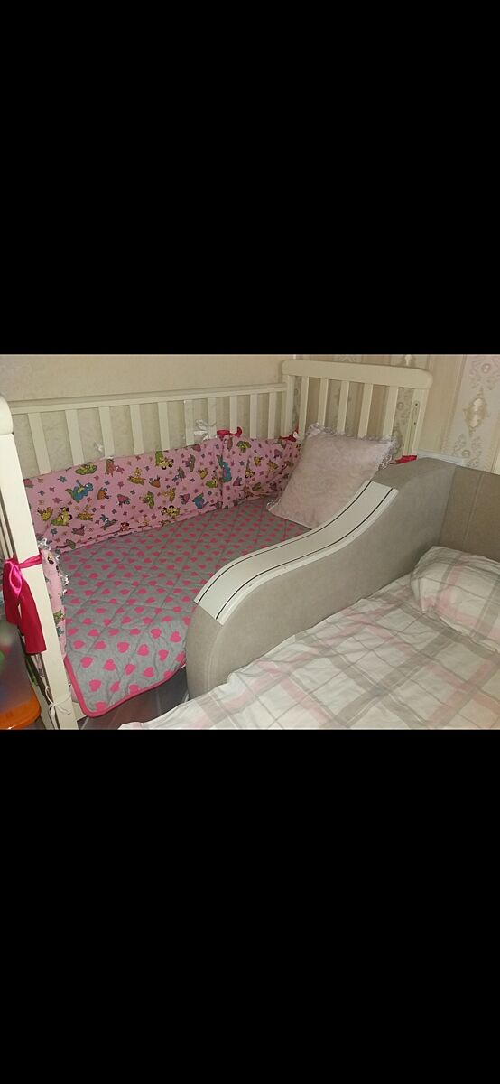 это наша кровать была) на диване тоже подлокотник, как видно. Когда была масенькой, я просто опускала переднюю планку на самый низ, после года уже сняла и придвинула ее впритык к дивану.