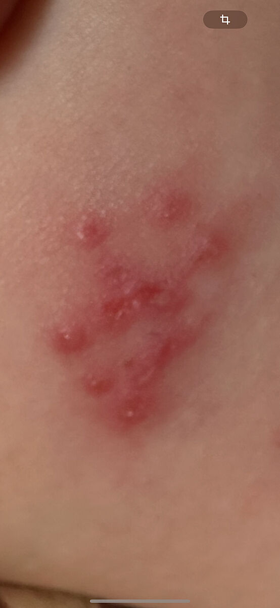 гпт говорит герпетическая инфекция или герпес-зостер. ацикловир\ валацикловир местно антисептик хлоргекседин\ меримистин при зуде антигистамминые Цетрин, Лоратадин. Не трогать не чесать контактно заразная штука. Хорошо бы к врачу.
