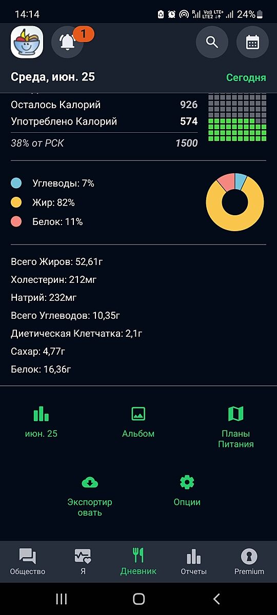 А давайте рахувати інакше. Ви в квартирі сама? Скільки хліба ви купуєте за тиждень, і якщо вам хтось допомагає, то скільки ви з´їдаєте самі? Скільки сала ви купуєте на тиждень, скільки масла вершкового, скільки олії, скільки авокадо, скільки ковбаси та смажених котлет, скільки сиру і яка жирність. Порахуйте що купили за тиждень та розділіть на 1 день. То може вийти зовсім інша картина. Бо ви трошки мухлюєте. Пишете тільки один прийом їжі в різні дні.