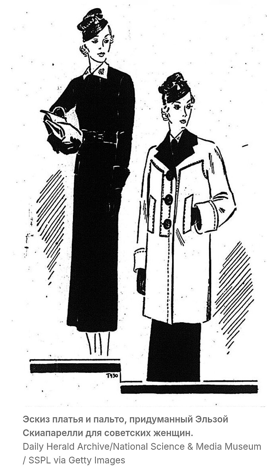 А Скиапарелли еще до войны разрабатывала проект советского типового женского костюма для массового производства. А сейчас жена Безоса в платьях ее имени. И много кто еще.