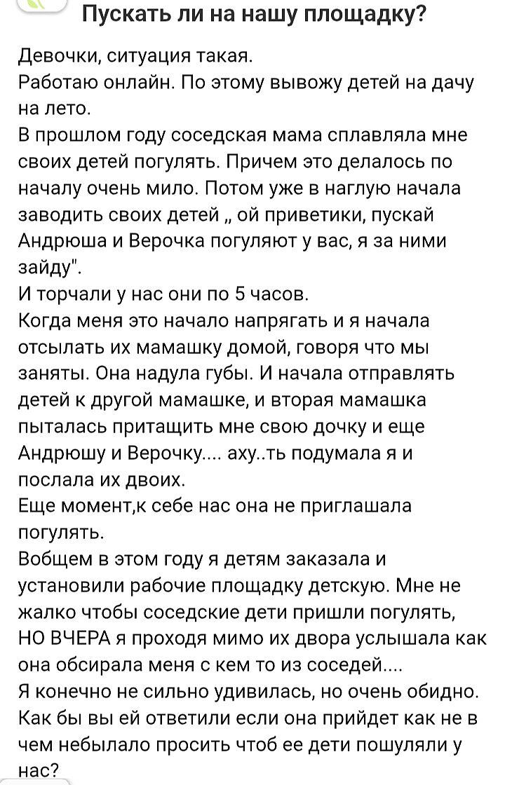 Автор теперь местная плохая соседка что не впускает себе детей поиграть. Мол «жалко, что ли?!». А автор не хочет помогать змее, которая ее за спиной грязью поливает.
