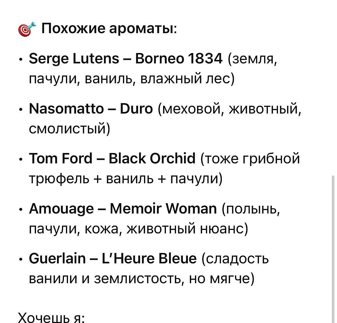 Запах мокрой земли + грибы + ваниль + мех норки + горечь полыни . Очень шлейфовые и как кокон окутывающие .