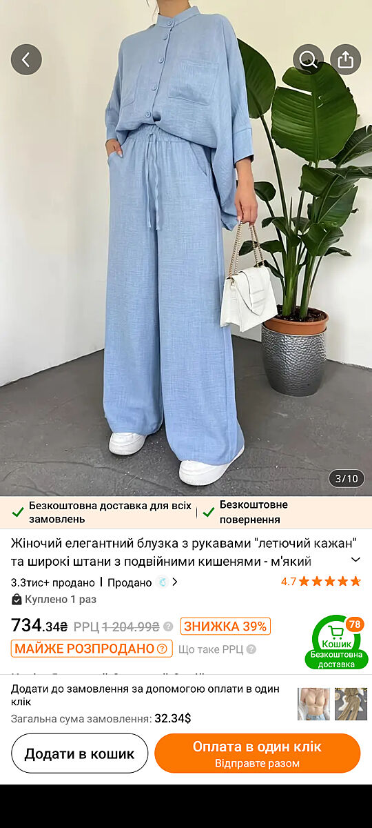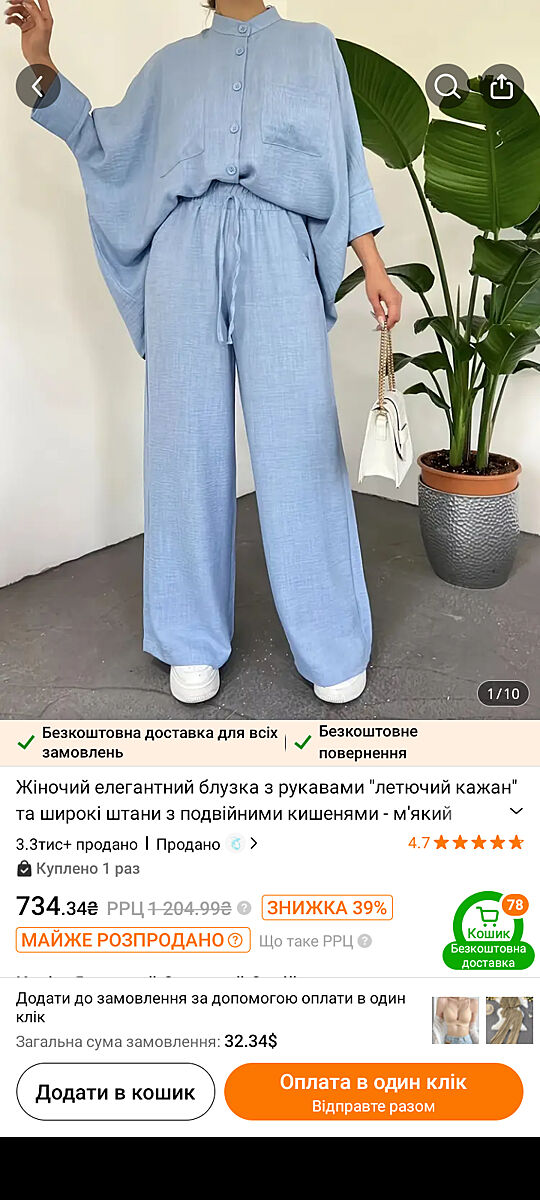 У меня в основном проблемы с размером, то маломерит, то наоборот. Хотя параметры свои знаю и беру по ним. Но уже вроде как научилась выбирать. Купила голубой костюм с рукавами летучая мышь, очень боялась, что не подойдёт, но очень даже симпатично.
