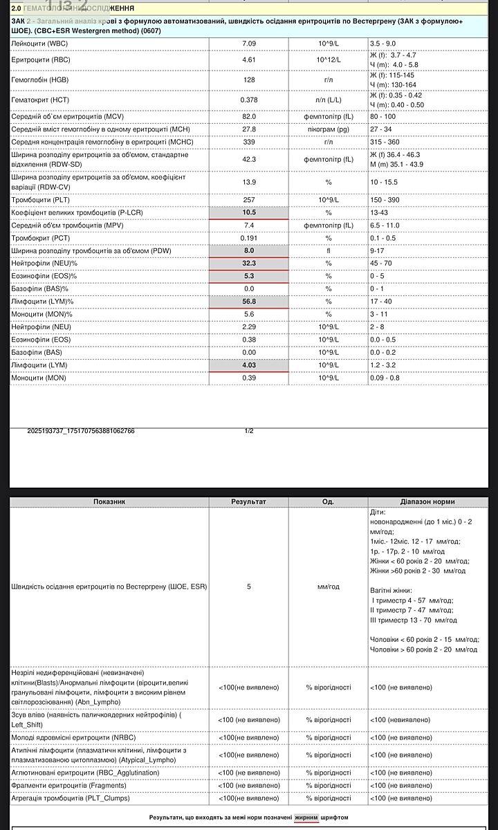 Це коефіцієнт великих тромбоцитів нижче норми, але не критично.Не має значення в даному випадку, якщо немає проблем зі згортанням чи кровотечами.NEU% (нейтрофіли) — 32.3% (норма для дітей ≈ 45–70%)Зниження нейтрофілів EO% (еозинофіли) — 5.3% (в нормі 0–5%)