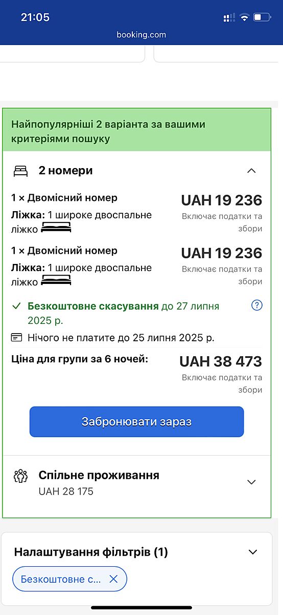 Розглядаємо готелі і квартири. Зірочка в тому що їде мама чоловіка. Мені б хотілося якось окремо. Тобто два номери/дві малюсінькі кв.