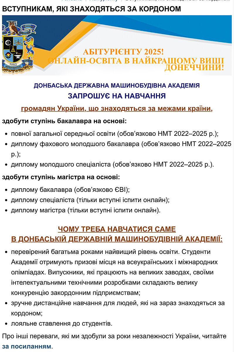 Може для когось ця інформація буде цікавою. Донбаська державна машинобудівна академія (м. Краматорськ) на даний час юридично знаходиться у Тернополі. Навчання веде виключно в дистанційному форматі. Сесії і захист дипломів також в дистанційному режимі. Вступна кампанія відбувається в звичайному форматі. Має широкий перелік спеціальностей.