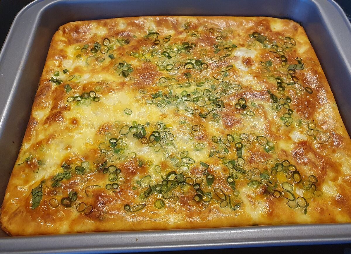 Омлет с ветчиной, сыром и зелёным луком.