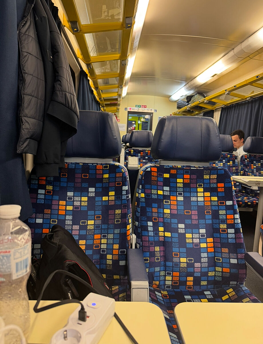 В этой электричке есть два класса. Второй - по два места вокруг столика одни напротив других. Немного все уставшее. Кондиционеры там есть, но нужно быть готовым к тому, что венгерские жд могут подать вагон с неисправным кондиционером. Через два часа в туалеты будет неприятно зайти. Там до Вены никто не будет убирать. Есть вагон ресторан, в котором через час заканчивается всё, кроме пива и дорогих сендвичей.