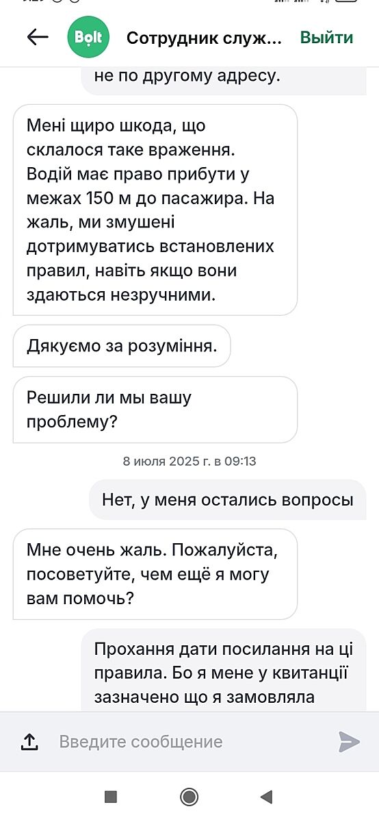 Впервые такое встречаю, ранее никогда не пользовались такси болт. Только уклон, 838, и разными по телефону. В уклон отменять можно такси в любой момент (им я чаще всего пользовалась). В болт произошла спорная ситуация. Заказываю на адрес, ставлю точку на карте. Водитель приезжает за соседний дом, становится за гаражом и ставит что он на месте, отмену сделать нельзя, только платно. Болт доказывает что водитель имеет право приехать в радиусе 150 метров. То есть если вызывает человек с переломом ноги или военный без ноги (как мой брат), то он обязан искать водителя, а иначе отмена платная и деньги не возвращаются. Это норма? Зачем тогда такси вообще если с таким успехом можно по возможности дойти до остановки общественного транспорта. Это только в болт такой бред?