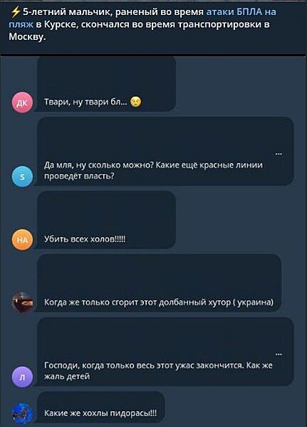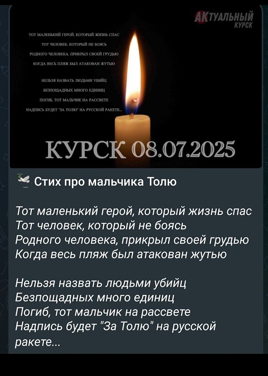 На болотах опять строчат вранье.Россияне заявляют что в Курске украинский беспилотник ночью атаковал пляж, в результате чего погиб 5-летний мальчик.