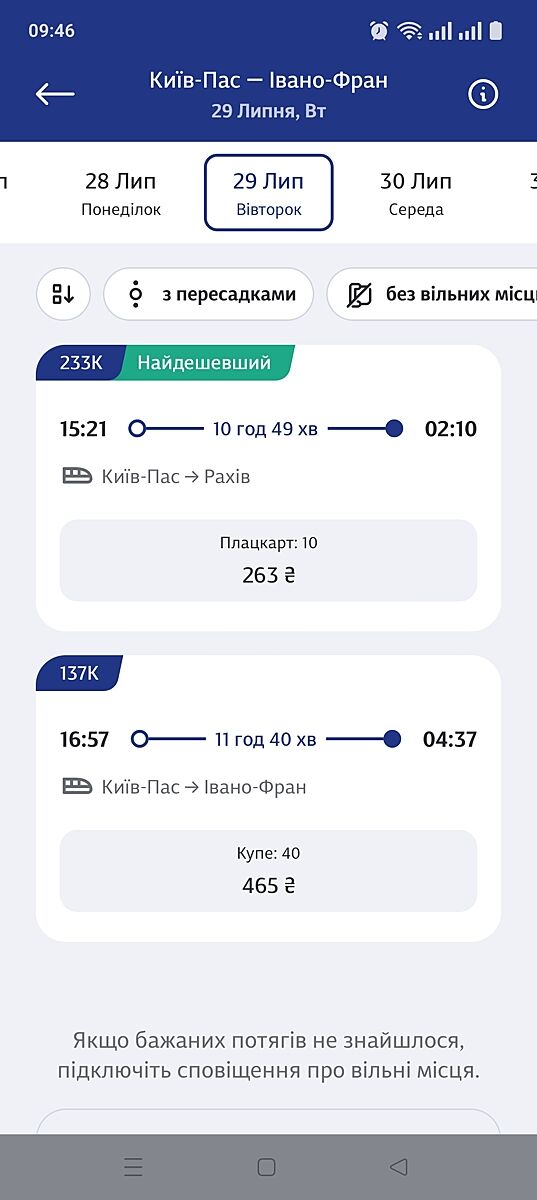 Автор, а куда билетов нет? Вот из Киева во Львов, Одессу, Франик и Черновцы на 20 дней в глубину. Так уже почти два часа продажа идёт. А если бы мне нужно было не из Киева и на какую-то промежуточную станцию типа Тячев, то я бы и такие билеты нашла и купила. Просто вовремя открыв приложение .