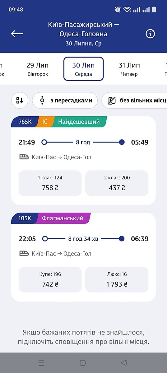 Я спокійно купила квитки в Одесу, ще й пропустила дату появи, взяла на наступний день. Ну да, не купе, бо все викуплене. Взяла плацкарт. І навіть нижнє було.