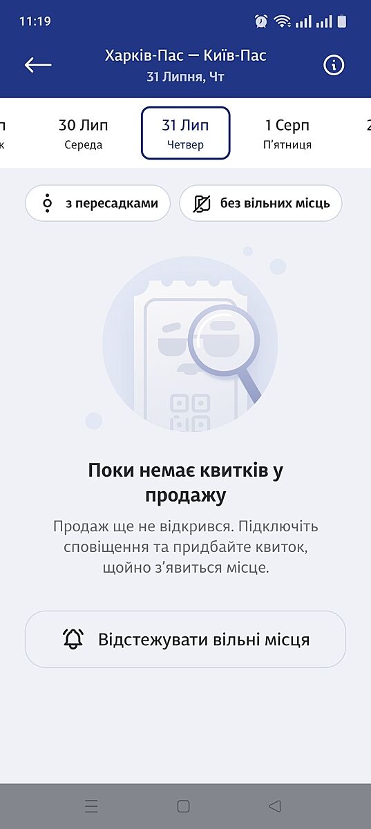 Посмотрите, какое чудо чудесное! Поезд Харьков-Киев, 31 июня, на которое ещё не продаются билеты. И что мы видим? Кнопка Відстежувати вільні місця!!!!!!!