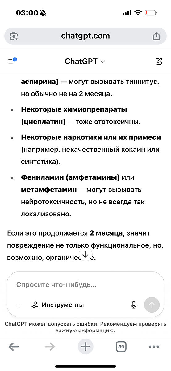 Если ты имеешь в виду, что **единственное вещество — это 3 бутылки пива Corona**, и после этого уже **2 месяца держится шум в ушах и отклоняет в сторону**, то пиво само по себе не может вызвать такие длительные симптомы.