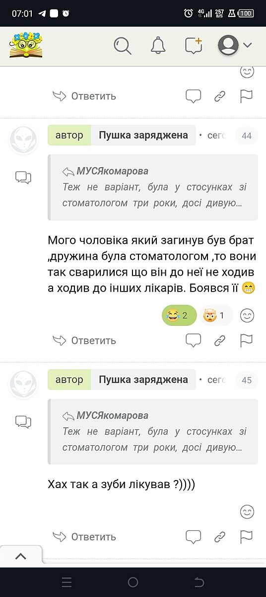 Мого чоловіка який загинув був брат ,дружина була стоматологом ,то вони так сварилися що він до неї не ходив а ходив до інших лікарів. Боявся її 😁