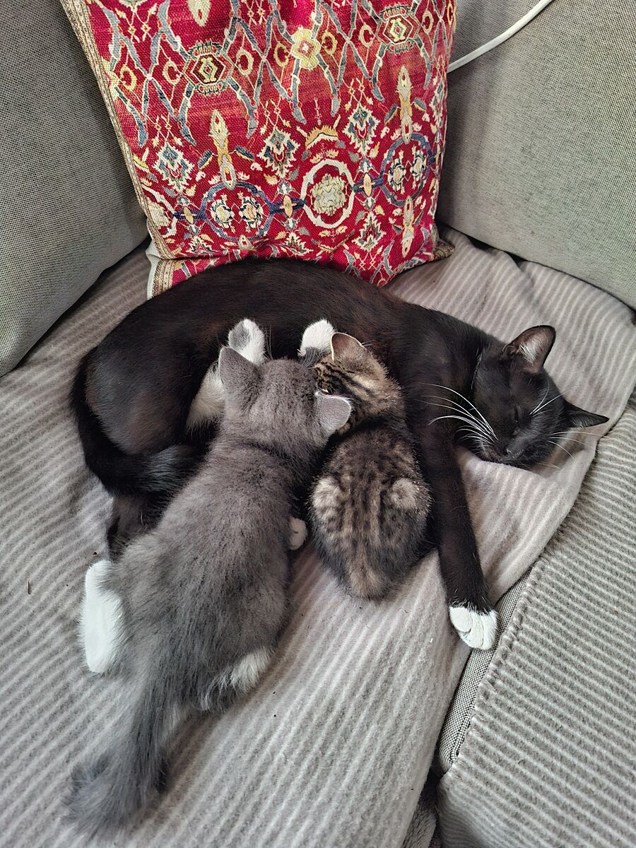 Мы кастрируем её точно, договорились с ветеринаром в селе. Ждём пока она перестанет кормить. Она ещё с зимы у нас подкармливалась и мы считали, что она мальчик..а потом этот мальчик родил)