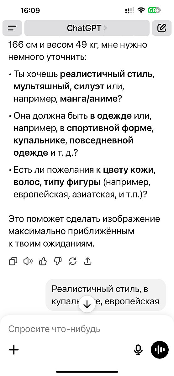 Я создала пока в ИИ, очень похоже изобразил на меня. Только талию мне приделал широкую какую-то.))