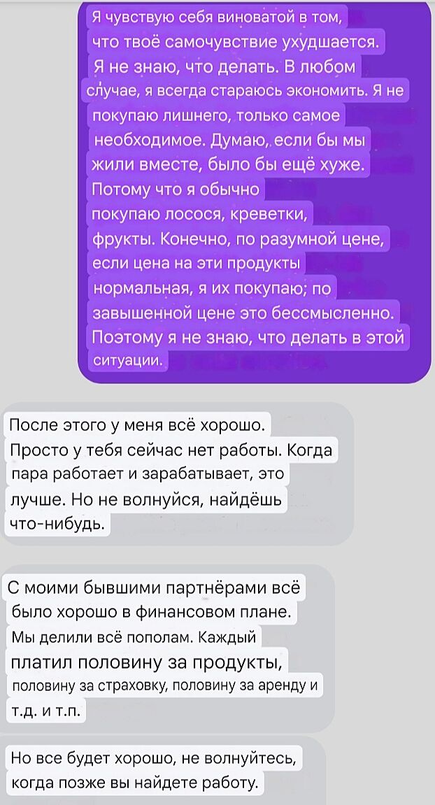 Постараюсь коротко.... Есть мужчина иностранец, встречаемся 8 месяцев. Большая взаимная любовь. Планируем женитьбу. Я без работы, дохода практически нет кроме очень маленьких выплат на меня и маму. Сейчас я очень много времени провожу у него. Со своей стороны я каждый раз привожу какие-то продукты, ингредиенты и готовые блюда для нас и для него лично. Часто покупаю что-то в магазинах где привозят "для наших" типа гречку, колбасу, конфеты и т.д. , часто заказываю разные витамины для него и био добавки на Айхерб, также разные сувениры и подарки из дома для него и его матери, племянницы. Расходы с его стороны это покупки в супермаркетах, иногда цветы для меня, когда едем к маме и ей тоже (но не те букеты как у нас дарят, гораздо скромнее), также походы в ресторан, кино, какие-то развлечения, что бывает не часто, но бывает конечно. Ну и конечно он платит за квартиру свою, электричество, бензин, налоги. Никогда намеков на оплату чего либо не было, хотя говорил, что оплата электричества возросла вдвое, так как я много готовлю. В общем сегодня пишет мне типа "Вот блин, оказывается у меня на карте минус 350 эвро, от банка пришло уведомлением". Ну дальше мои распросы что почём, он говорит типа: "Просто мы много с тобой в магазины ходим", ну я ответила что, мне кажется что без меня тебе жилось легче, он такой типа " Нет, мы разберемся с этим как-то, не переживай". Дальше я пишу текст (Фиолетовый) и он отвечает (фото ниже)Это переводчик, поэтому немного не правильно написано, но думаю все понятно... И я вот теперь не понимаю что делать ... Я не против конечно вносить свою лепту в семью, даст Бог я найду работу, но я не хочу быть партнёром, я хочу быть женщиной. Я хочу заботиться и покупать по надобности, а не делить...Или я не права? Не знаю, я в раздумьях, скажите мне как у вас? Как вы делите бюджет хотя бы в начале отношений и семейной жизни? Мне честно, хочется все бросить и уйти... Прошу не кидайте в меня камнями, особенно те, кто в Украине, касательно того, что не@уй с иностранцами лазить и ТД.