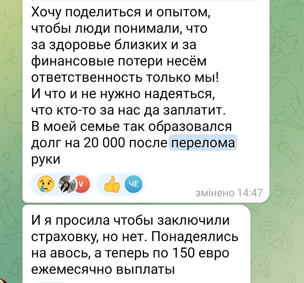 Моя подруга в Австрії зламала ногу. Тупо на рівному місці. Ставили пластину. Добре, що була страховка (380 грн на той момент), уявіть в скільки грошей обійшлося лікування, якби страхування не було би.