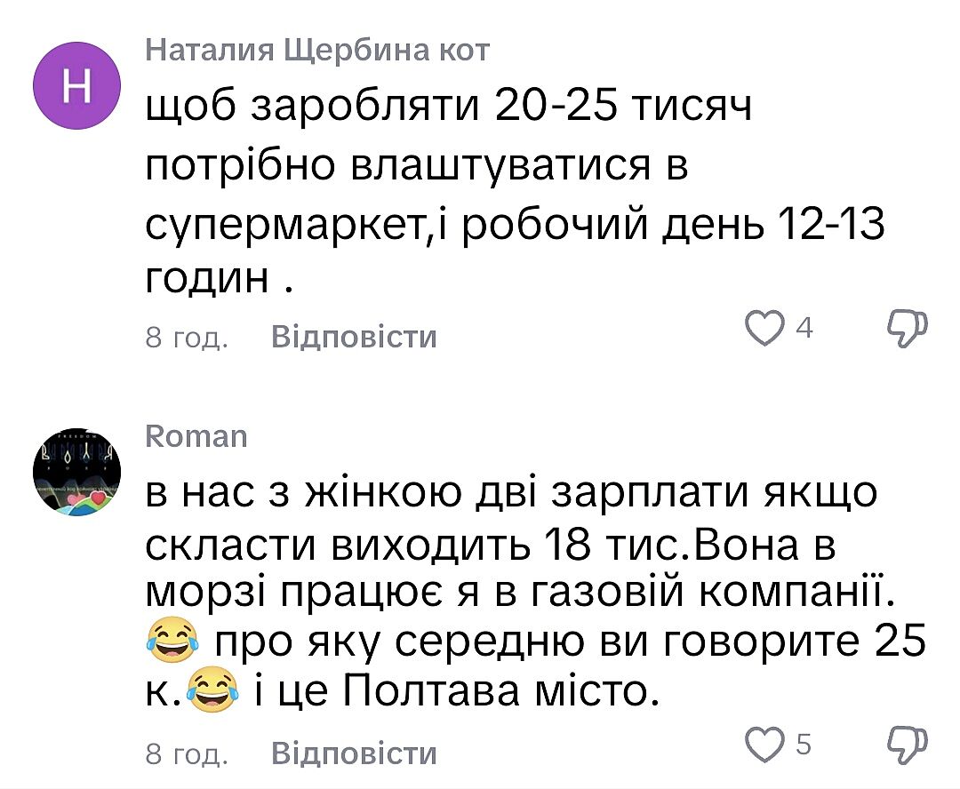 Пишуть, що середня по Україні зараз 25000, а люди в коментарях скаржаться.