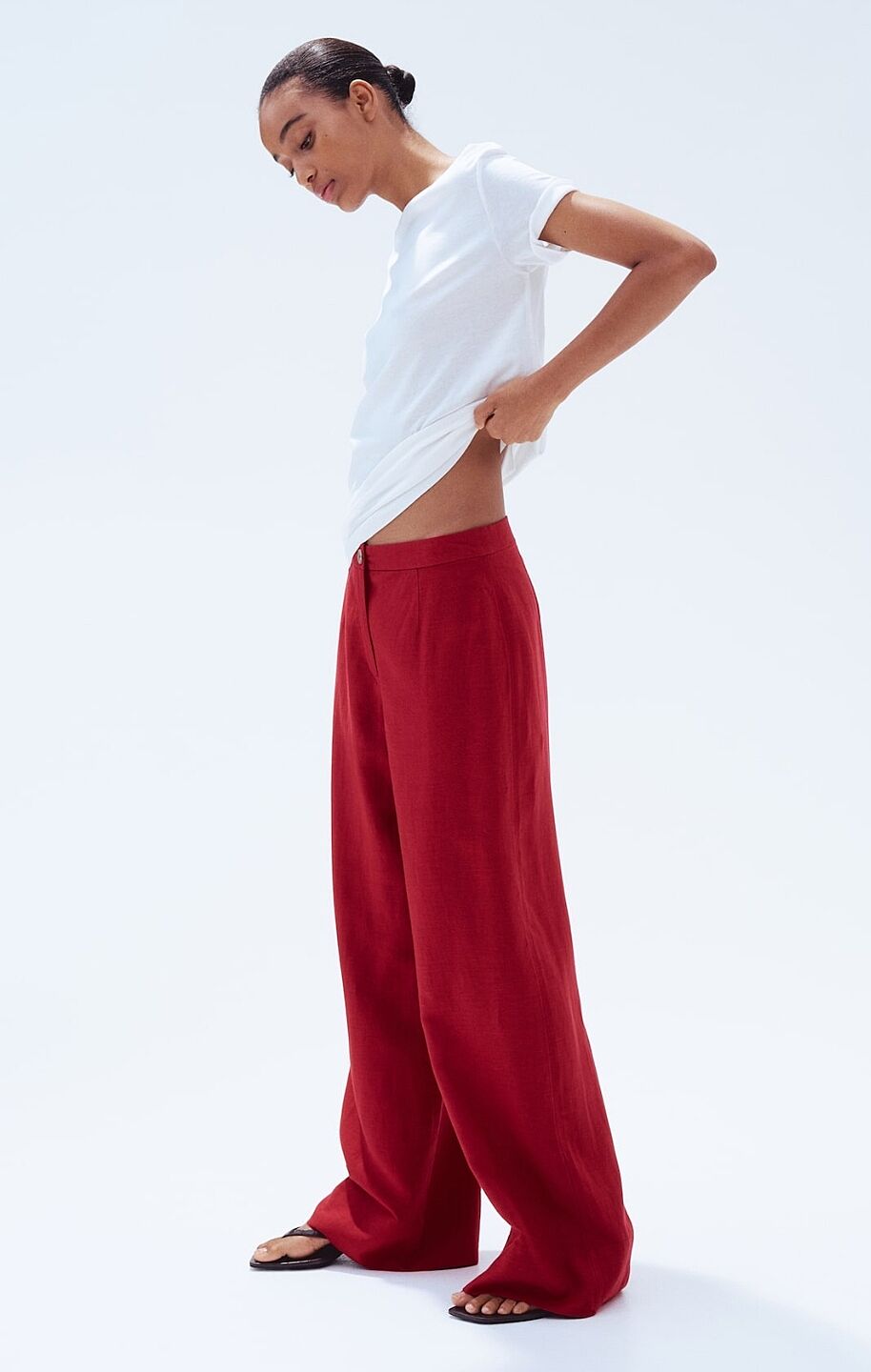 2. Красивая блуза. Очень сложно попасть тон в тон со льном, даже фактуры отличаются, и это уже будет не то. Может просто красные матовые брюки без декора?