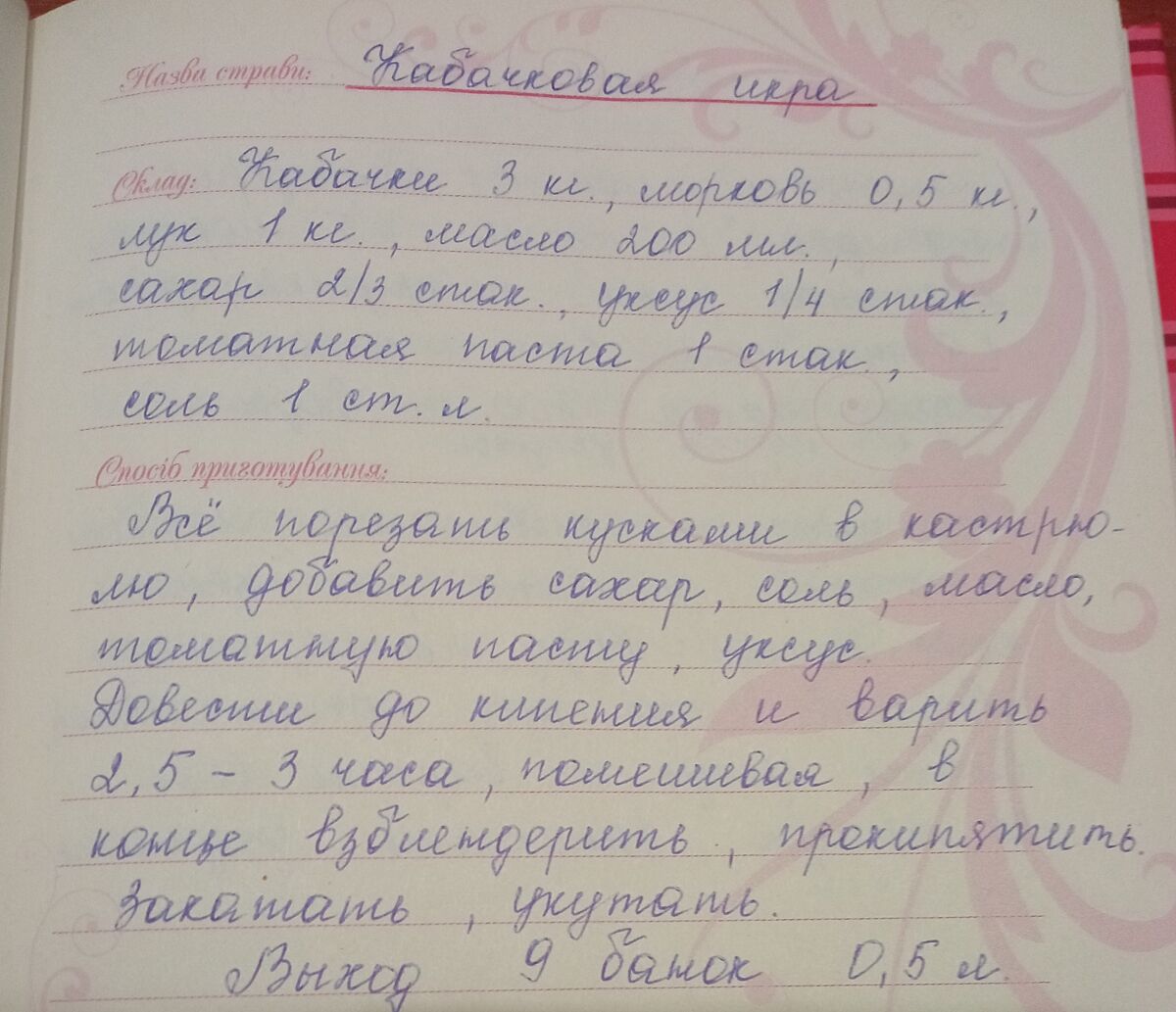 Значить, 5 кіло почищених вже кабачків крутите на м´ясорубку, додаєте півтори склянки олії, склянку цукру, 2 ст ложки солі, ложку молотого перцю чілі, 500 мл томат пасти, все це варите годину, далі даєте дві головки подрібненого часнику і 150 мл оцту 9% і ще хвилин 15-20 воно кипить, далі по півлітрових стерилізовних банках катається, перегорнули і під ковдру. В рецепті було вказано вихід 9 півлітрових банок, але у мене вийшло 11 і ще поїсти.