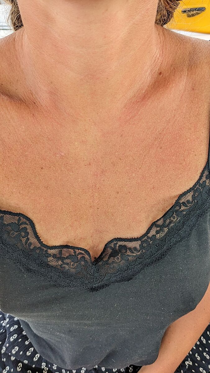 я прийшла сюда за порадою, всем спасибі. в результат моего декольте це загар я з 15 років на морі живу по суті і спф не завжди( плюс 12 років тому згадую. що була сильна алергія в зоні декольте все було червоне і в пухирях був сильний зуд, пролікувала відтоді декольте змінилося але я не звертала увагу, особливо вранці як на першому фото воно виглядає жахливо