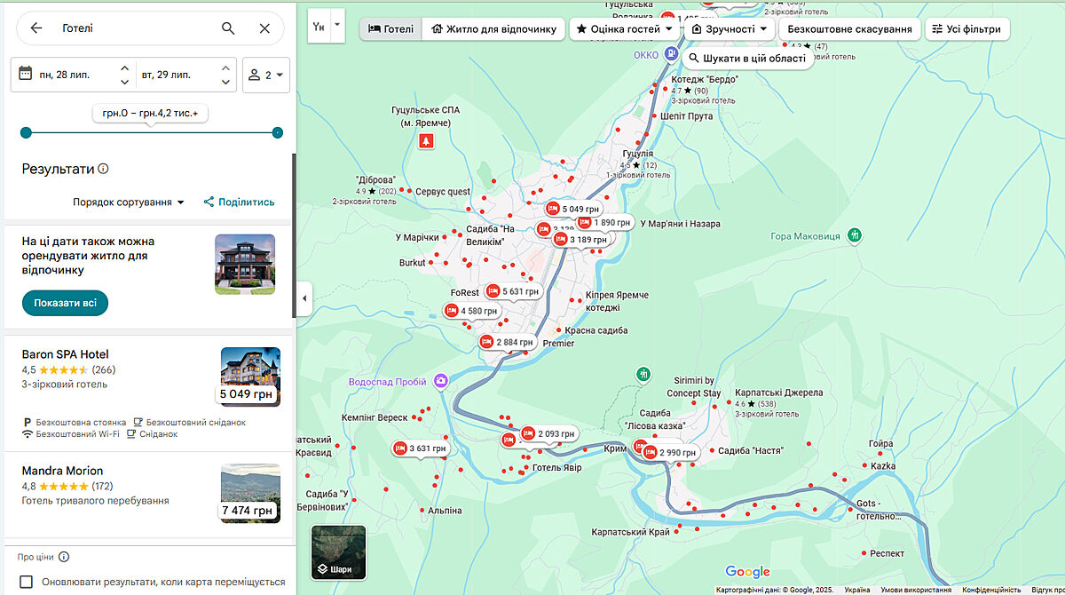 Ось все червоне це готелі або садиби/будинки, якщо їх немає на відомих ресурсах треба просто дзвонити по їх номерам