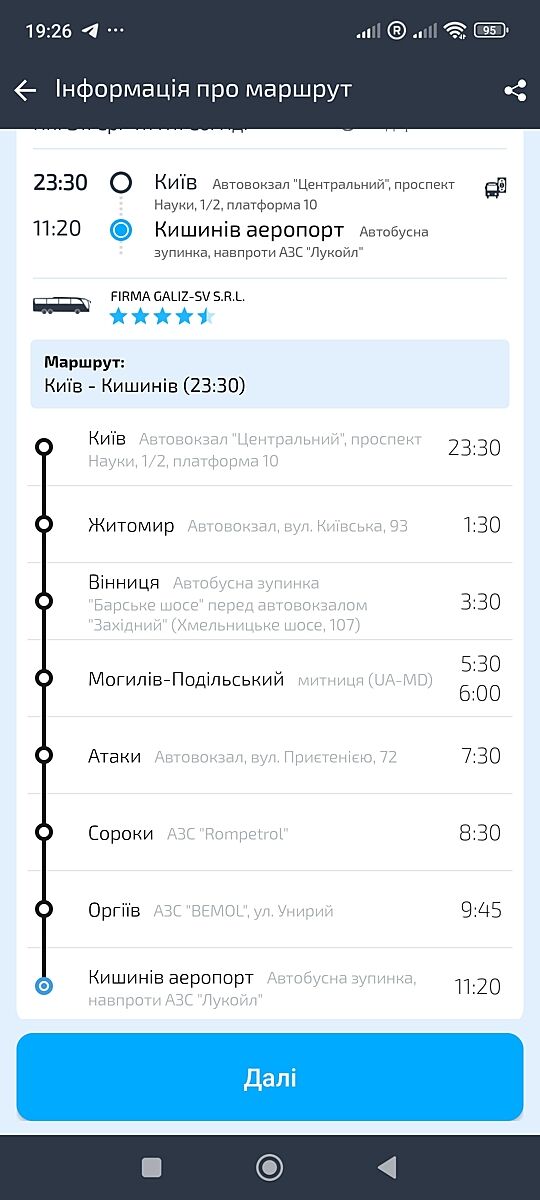 Їхала лише зворотнім рейсом цим маршрутом, з Кишинева, то зупинки були десь на Окко в Вінницькій обл ( 20 хв після Могилів -Подільська) і біля Житомира. Туалети в автобусах Галтранс не працюють