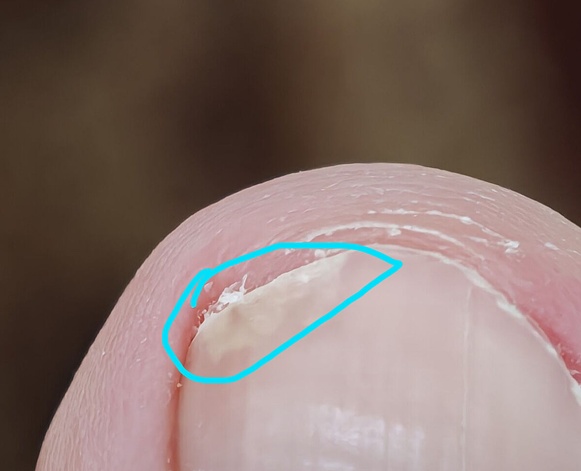 Да вот это. Что вас смущает, куча грязи под ногтем? Я все максимально обрезала когда увидела отслоение ногтя. Нечего сказать идите дальше